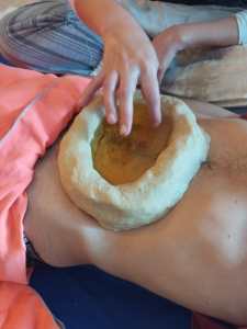 Il s’agit de délimiter une zone restreinte du corps par un anneau de pâte faite d’eau et de différentes farines et de verser à l’intérieur de ce cercle de l’huile tiède afin de traiter la zone congestionnée, douloureuse ou chargée d’émotion.